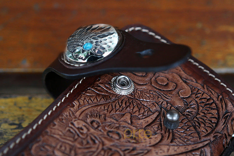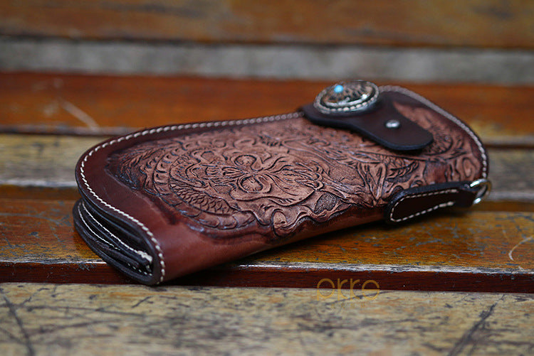 Cool Leather Tooled Biker Wallets Handmade Dragon&Skull Biker Chain Wallet for Men