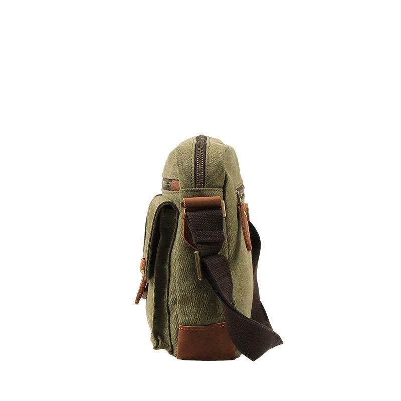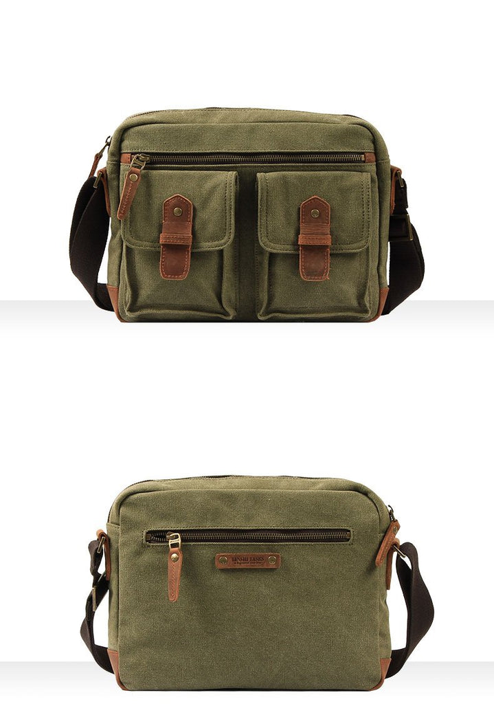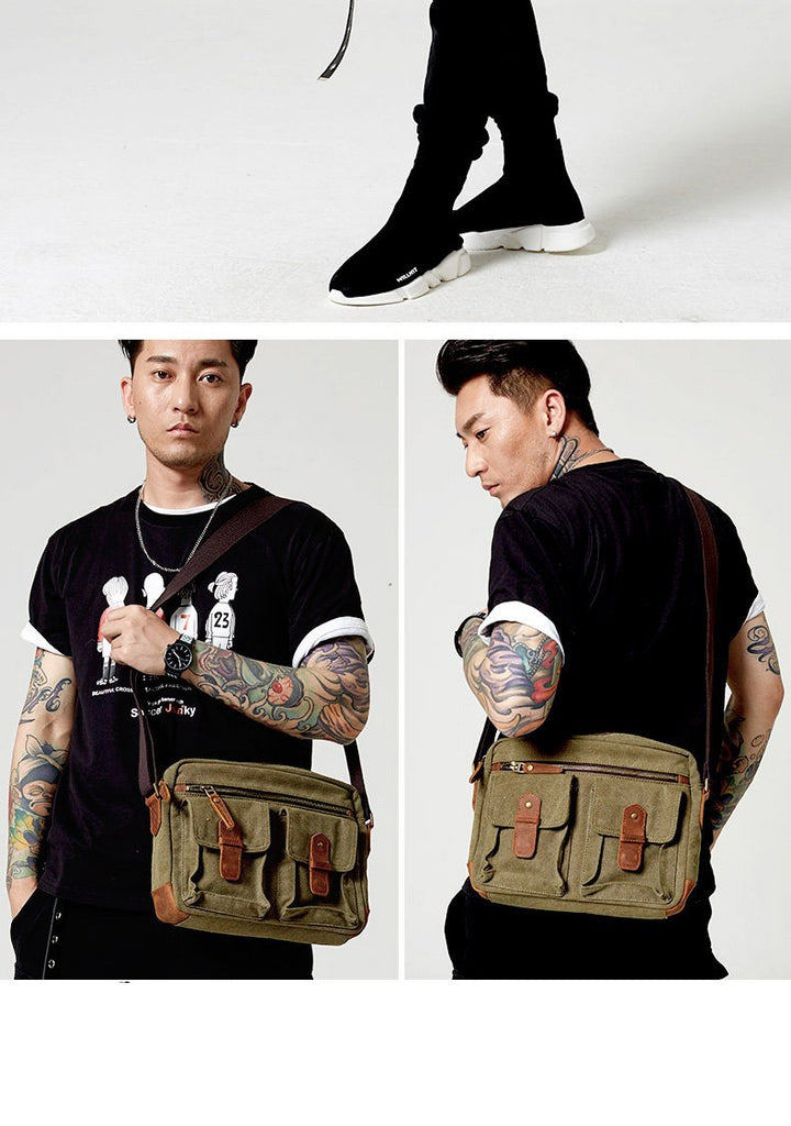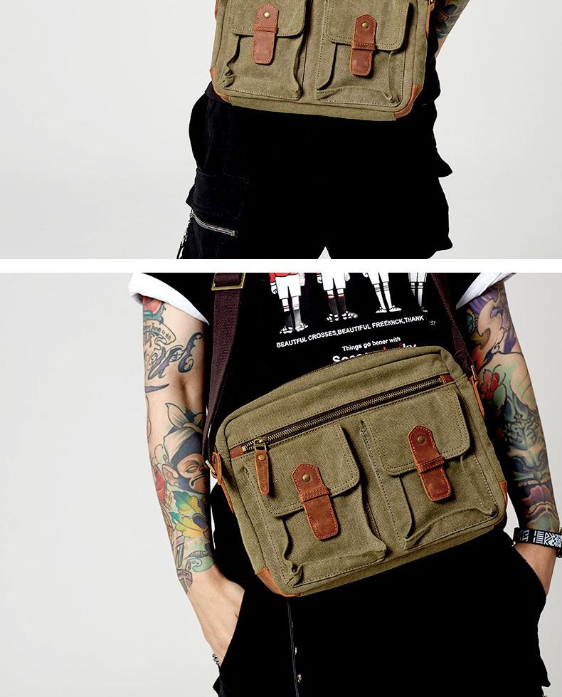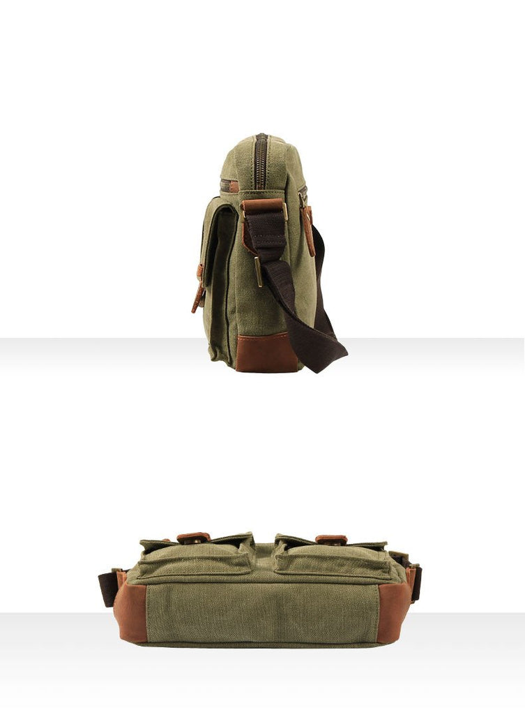 Design: Fashion Canvas Leather Mens Khaki Side Bag Messenger Bags Army Green Canvas Courier Bag for Men
