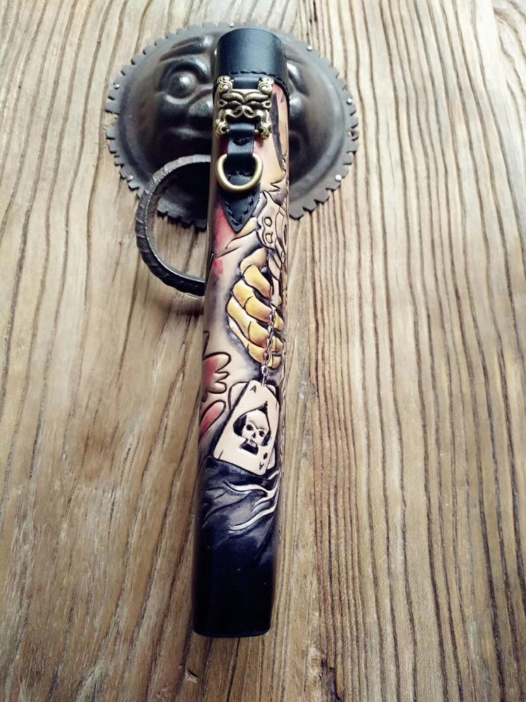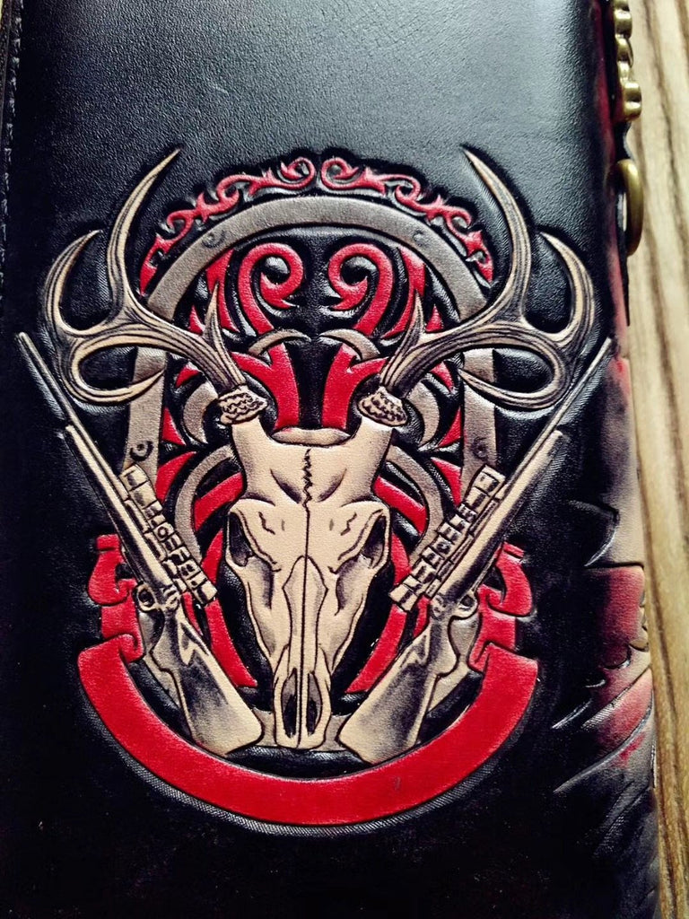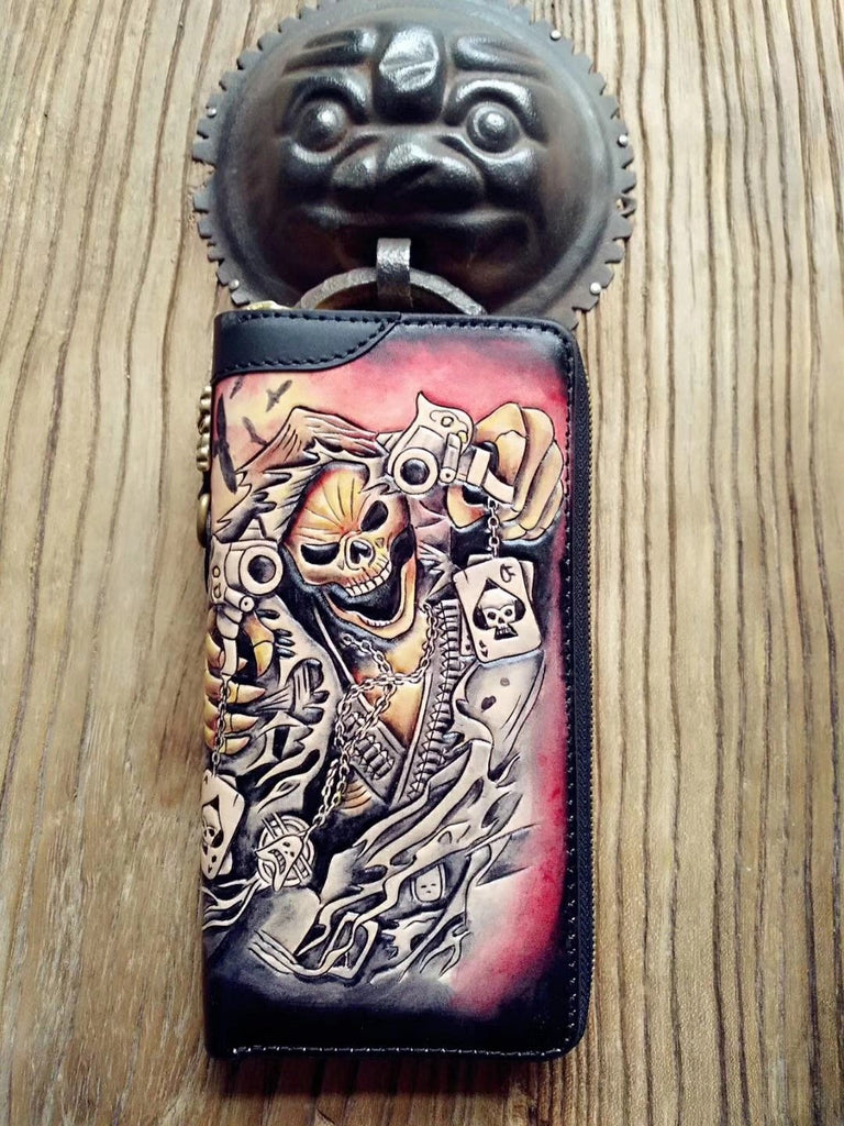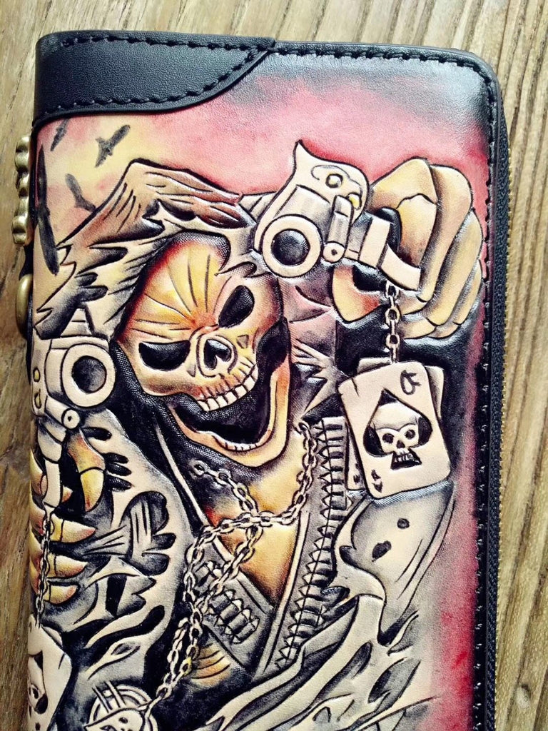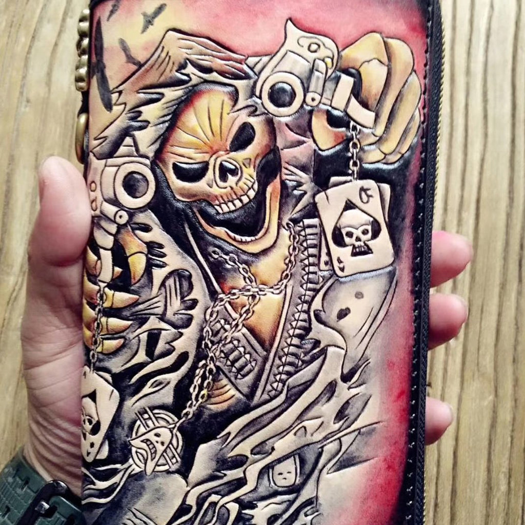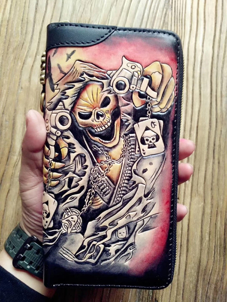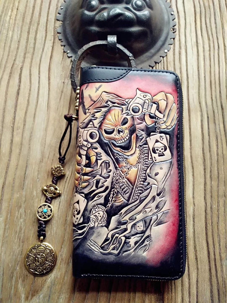 Design: Handmade Leather Mens Clutch Wallet Cool Skull Ghost Rider Tooled Chain Wallet Biker Wallets for Men