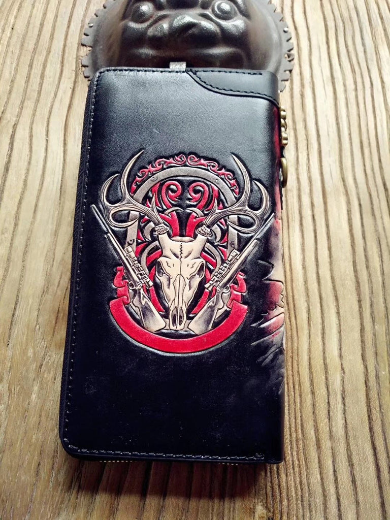 Style: Handmade Leather Mens Clutch Wallet Cool Skull Ghost Rider Tooled Chain Wallet Biker Wallets for Men