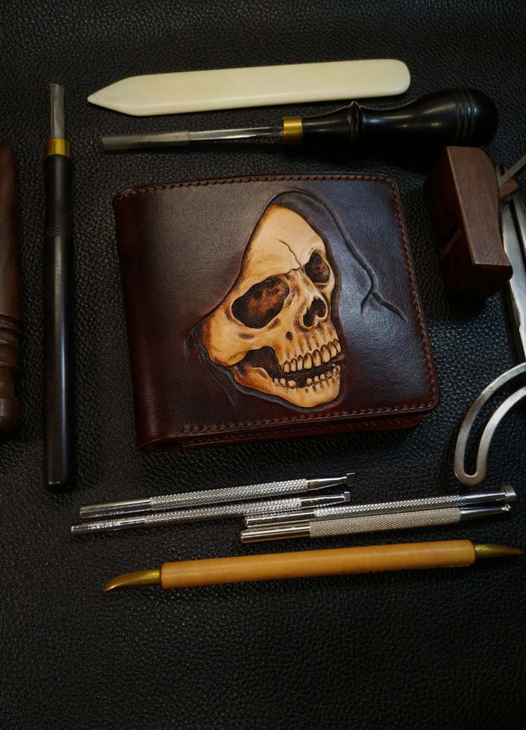 Style: Handmade Leather Skull Head Tooled Mens billfold Wallet Cool Leather Wallet Slim Wallet for Men