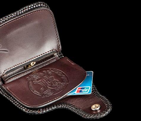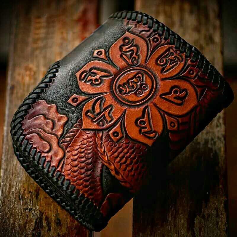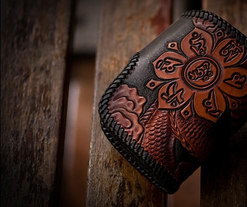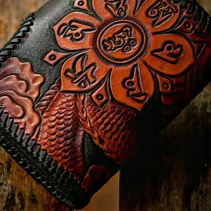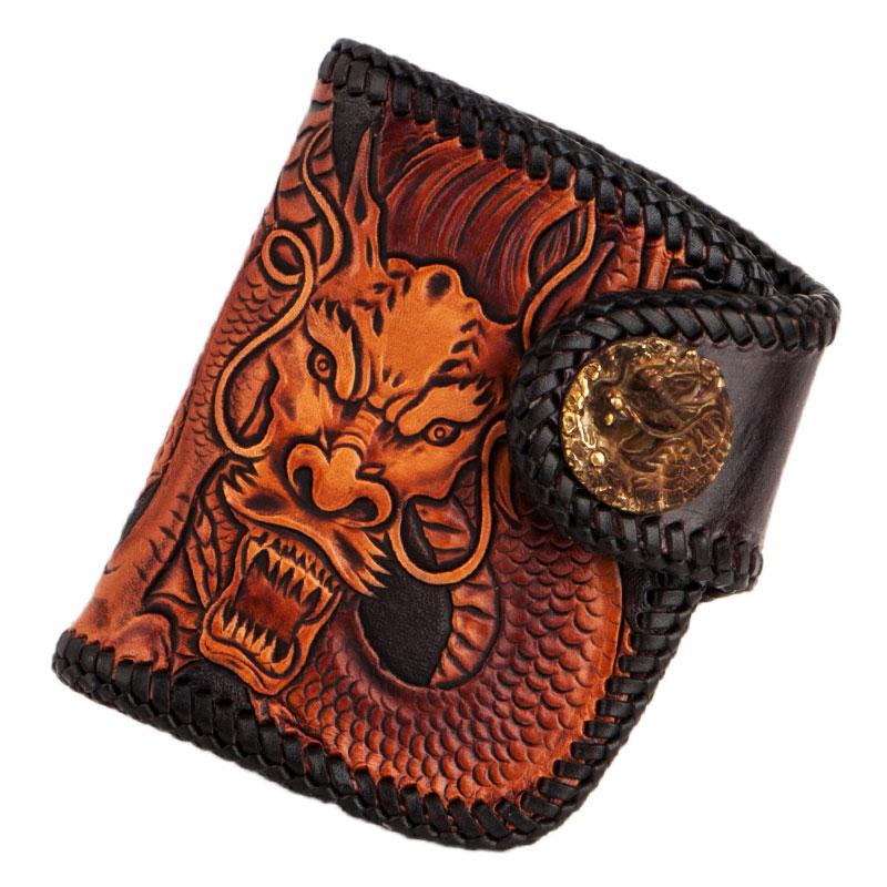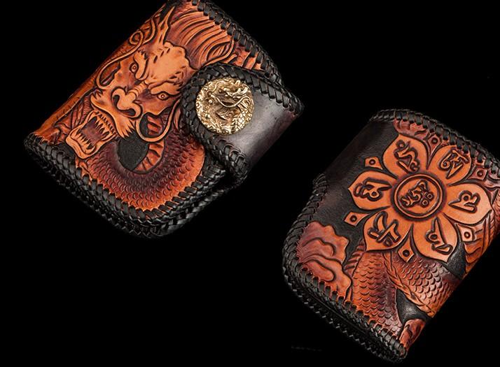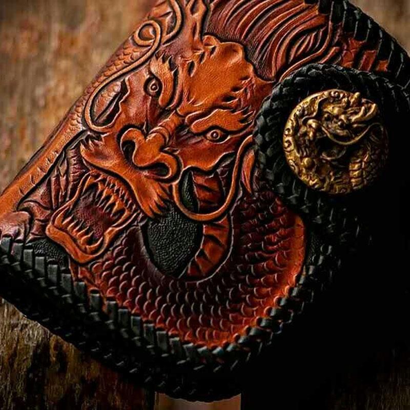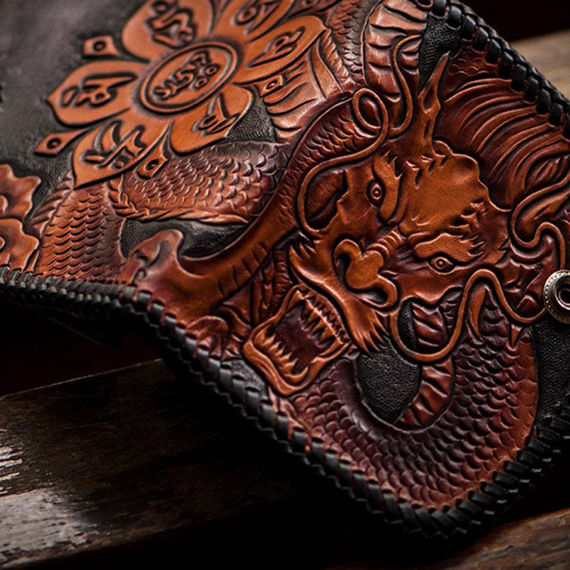Style: Handmade Leather Tooled Chinese Dragon Biker Wallet Mens Cool billfold Chain Wallet Trucker Wallet with Chain
