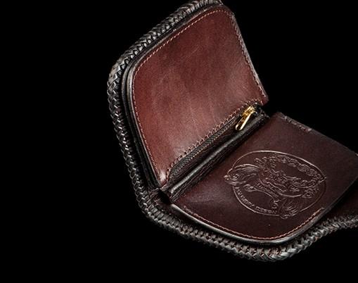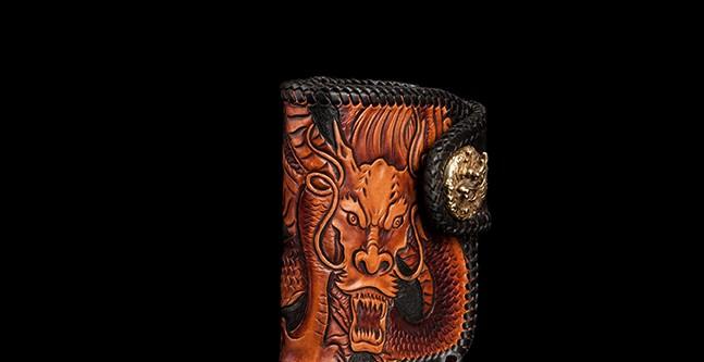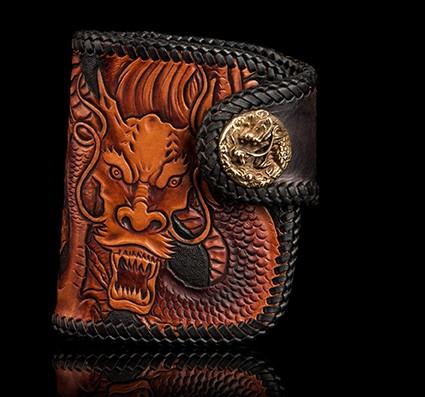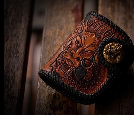 Design: Handmade Leather Tooled Chinese Dragon Biker Wallet Mens Cool billfold Chain Wallet Trucker Wallet with Chain