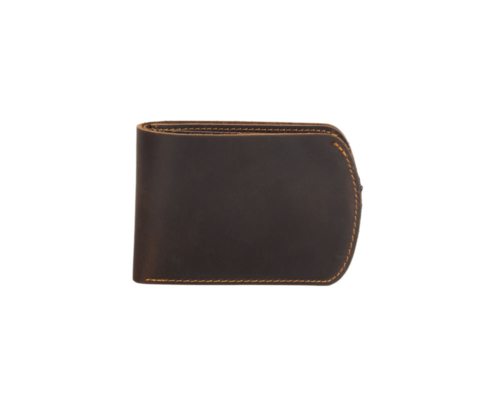 What truly sets this Brown Leather ID Billfold Wallet apart is its elegant curved silhouette. Unlike traditional rectangular wallets with sharp corners, this design features a graceful semi-circular edge along the opening side, creating a smooth, organic shape that stands out visually and feels comfortable in hand. The interior is intelligently organized with six card slots and a clear ID window, providing ample storage while maintaining an exceptionally slim profile. The crazy horse leather develops a beautiful patina over time, ensuring your wallet becomes uniquely yours with every use.