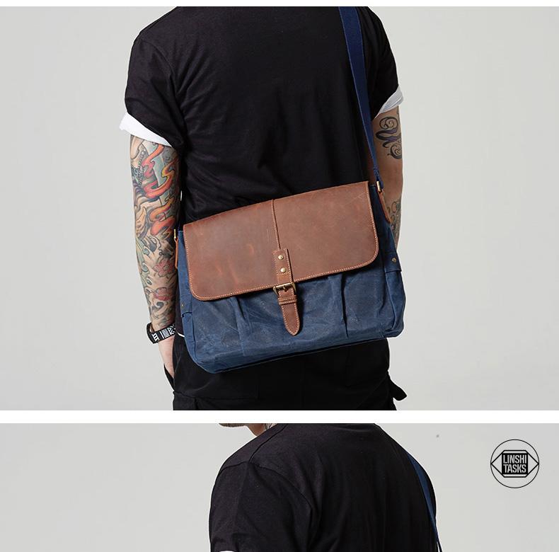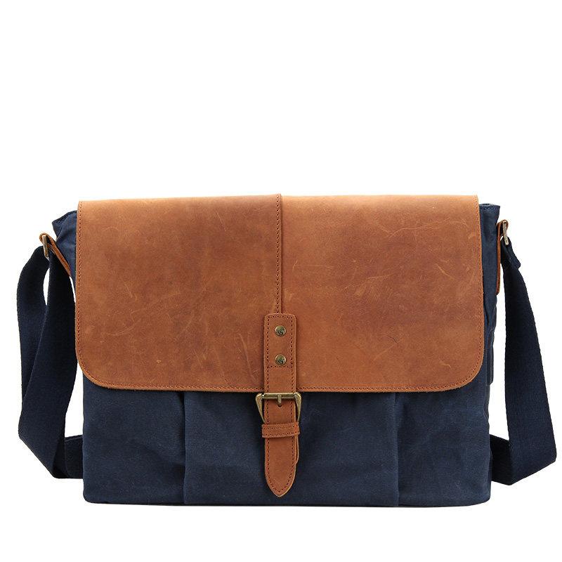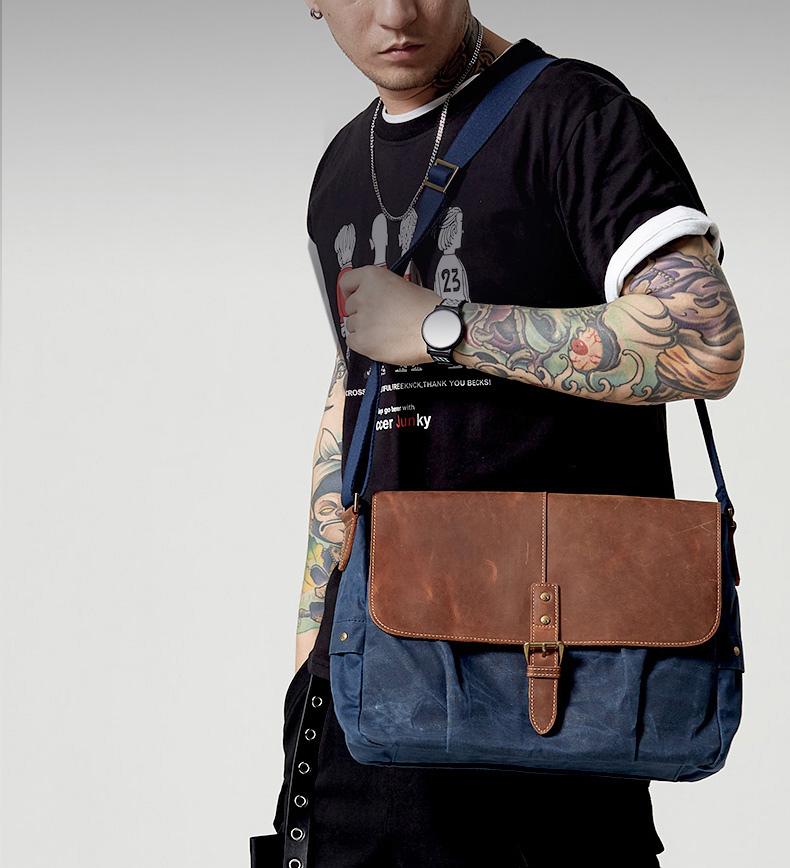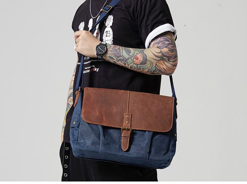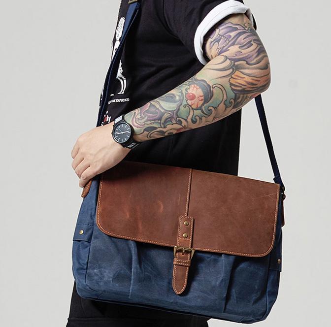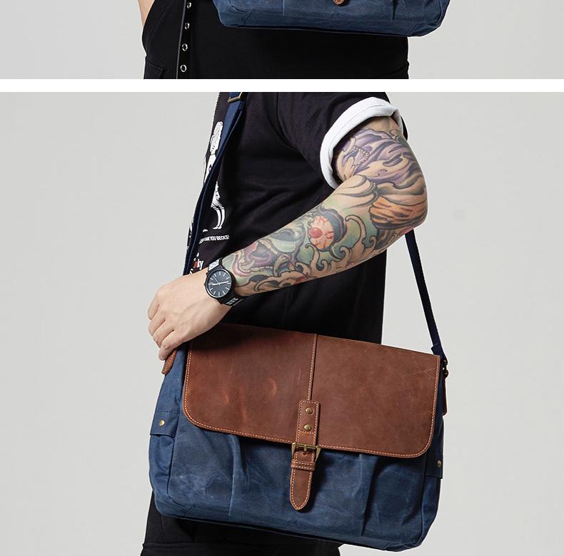 Design: Navy Blue Leather Canvas Mens Casual Light Gray Briefcase Shoulder Bag Messenger Bags Casual Courier Bags for Men