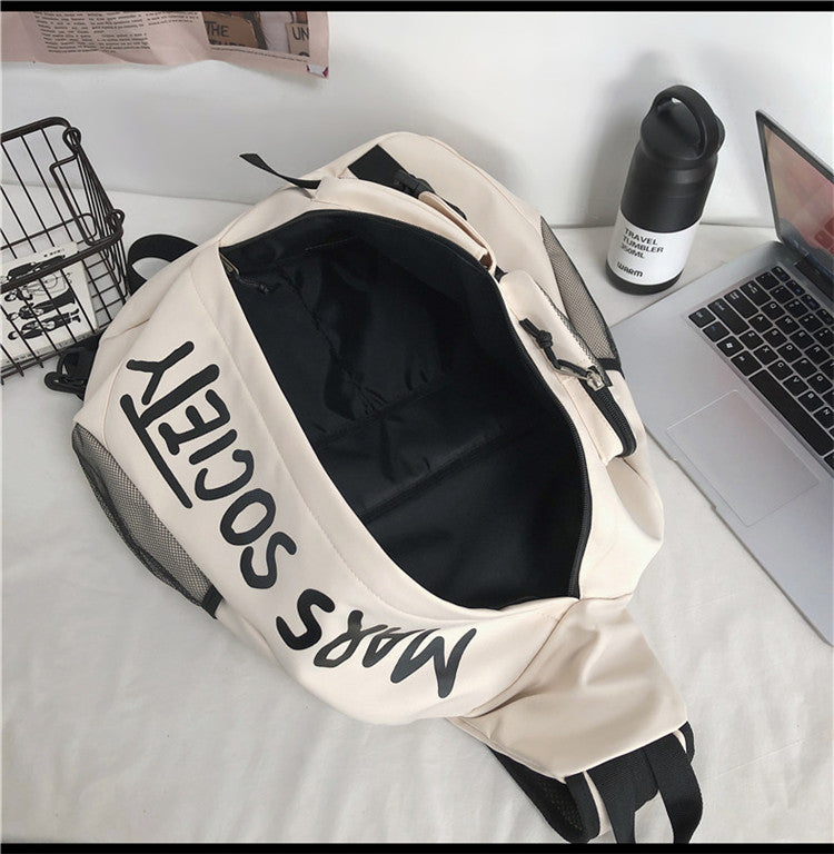 In terms of organization, the bag is equipped with two front pockets that offer convenient access to smaller items like keys, wallets, and smartphones. These pockets are perfect for keeping essentials within easy reach, enhancing the bag's functionality for everyday use. On each side of the bag, there are net pockets designed to hold water bottles or other items you need to grab quickly while on the go.