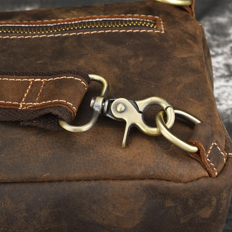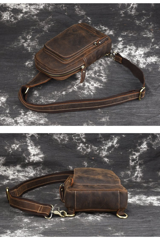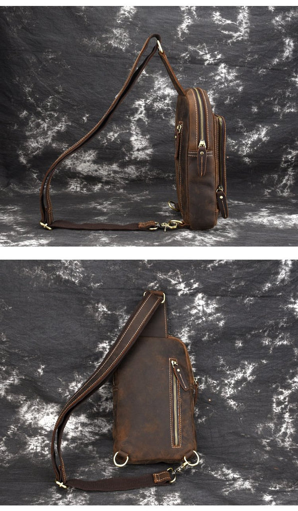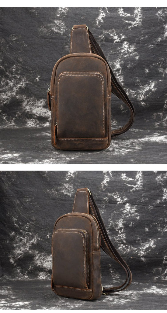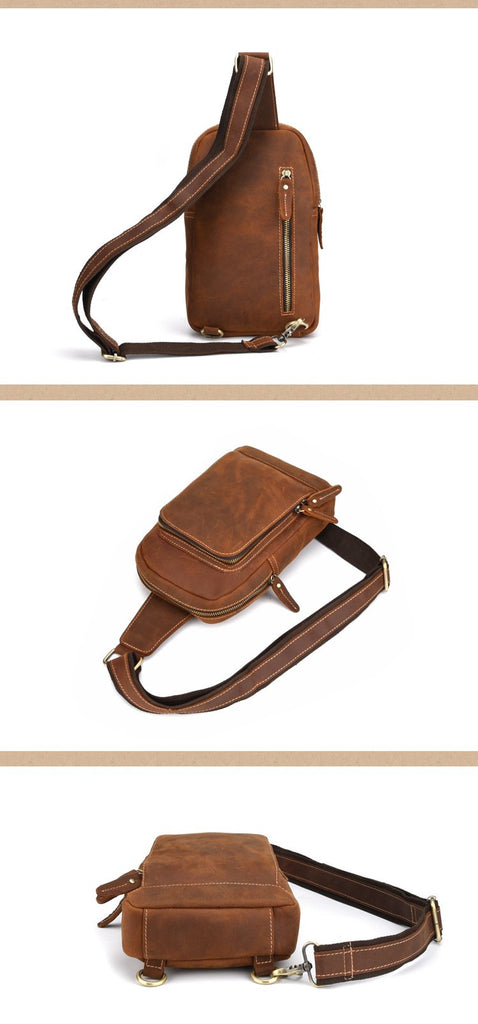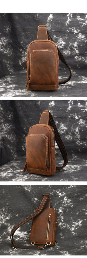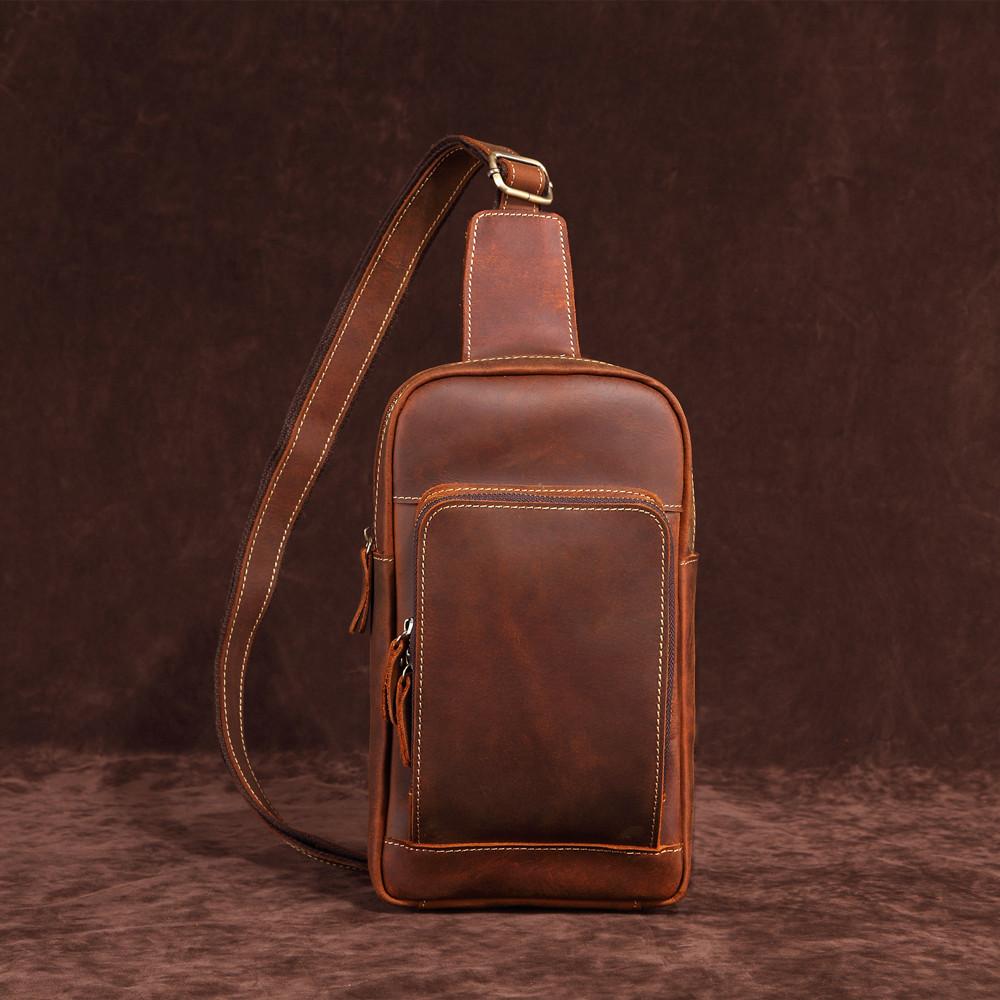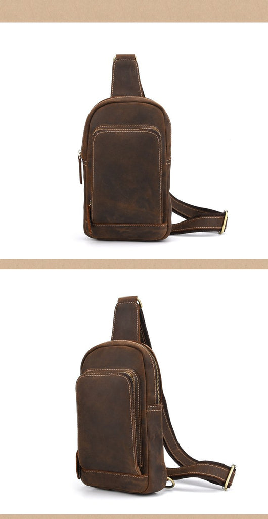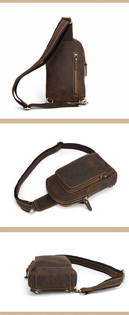 Design: Retro Brown Leather Men's Brown Sling Bag Coffee Chest Bag One Shoulder Backpack For Men