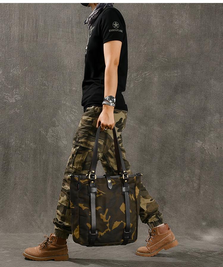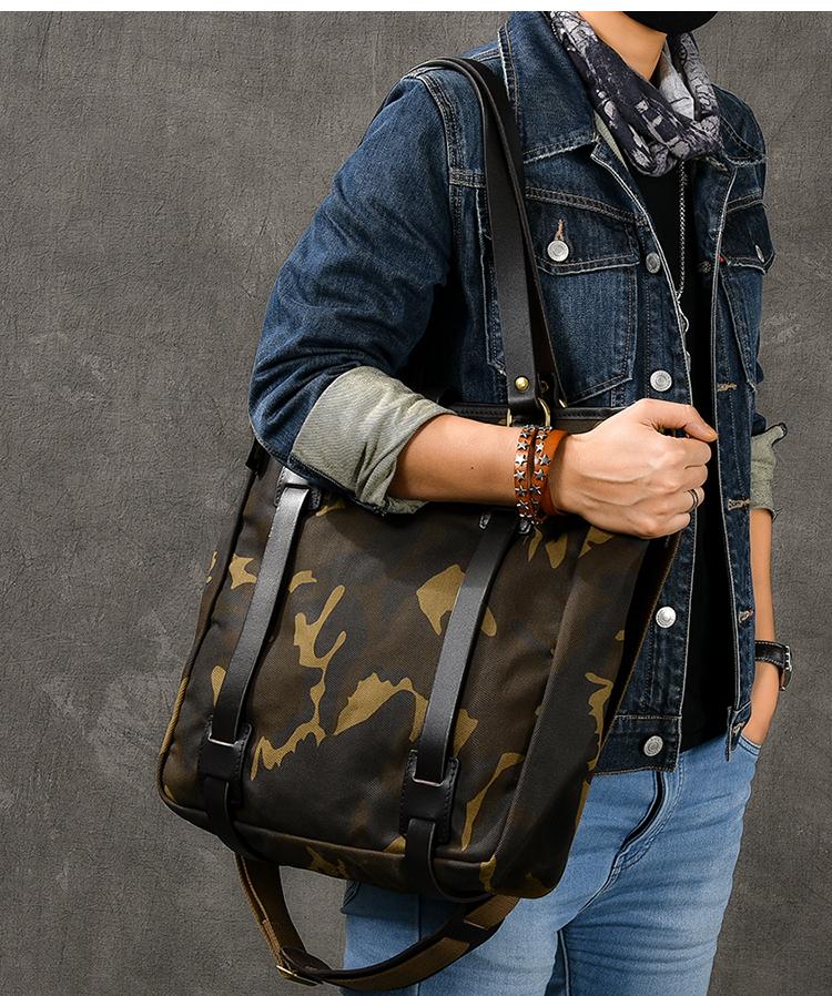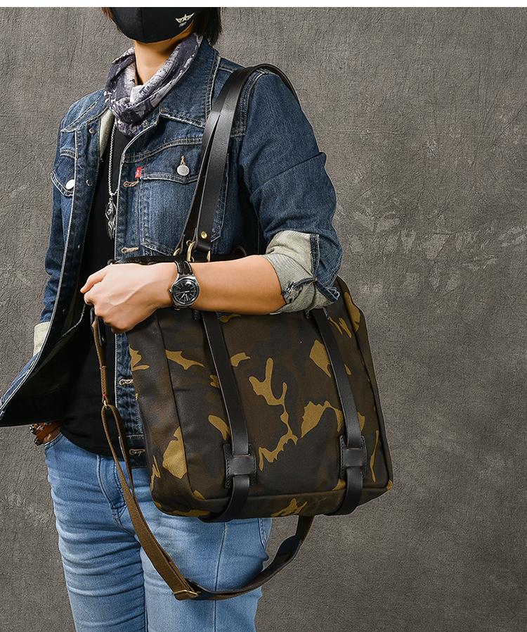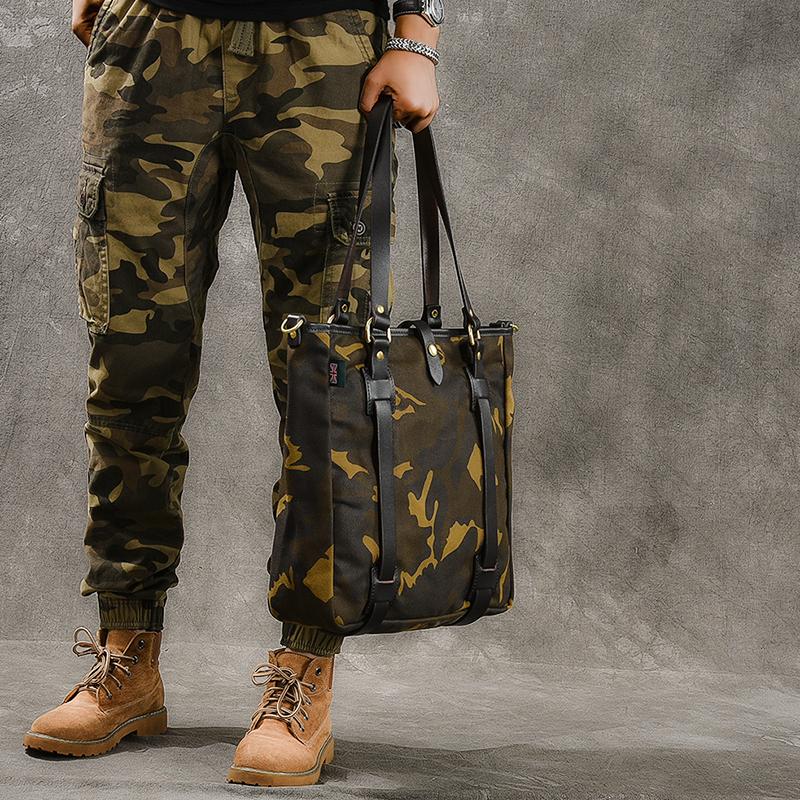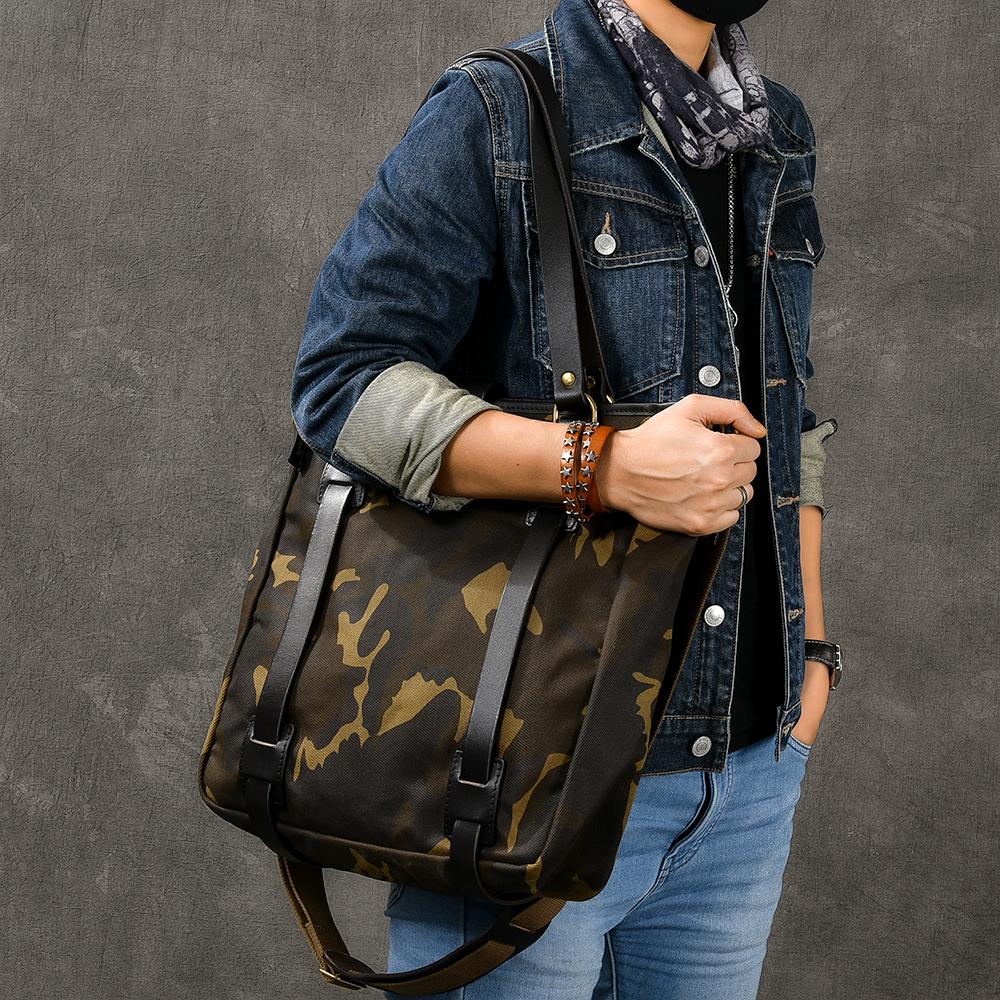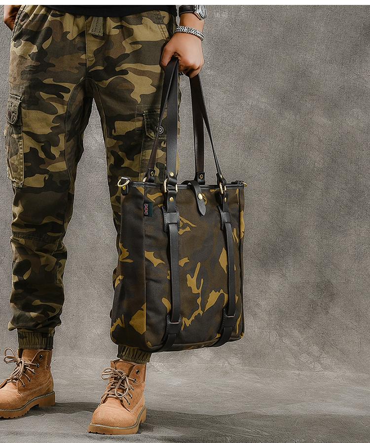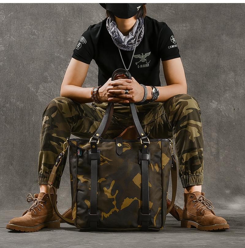 Design: Waxed Canvas Leather Mens Womens 14'' Camouflage Tote Bag Handbag Tote Bag Shoulder Bag Tote Purse For Men
